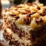- Drizzle the cream cheese icing over the cake and optionally sprinkle with chopped pecans and coconut.